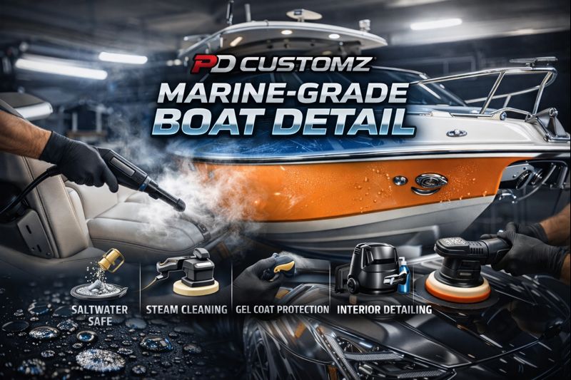 Comprehensive marine detail using boat specific, salt safe chemicals designed for gelcoat, vinyl, marine leather, plastics, and hardware
